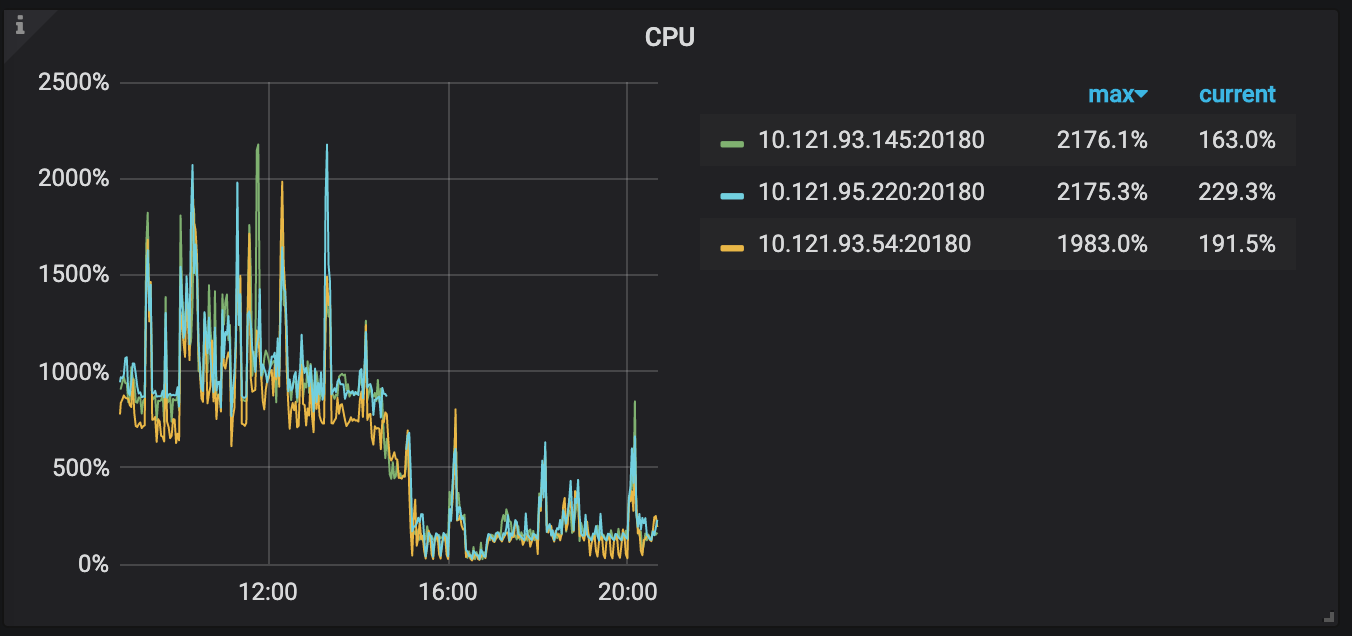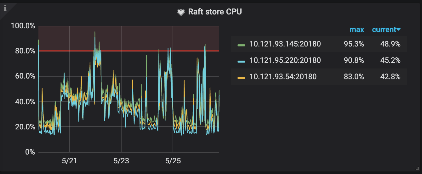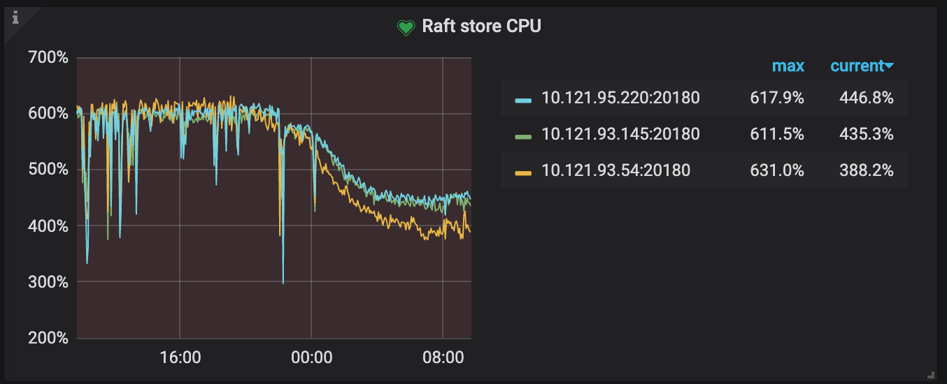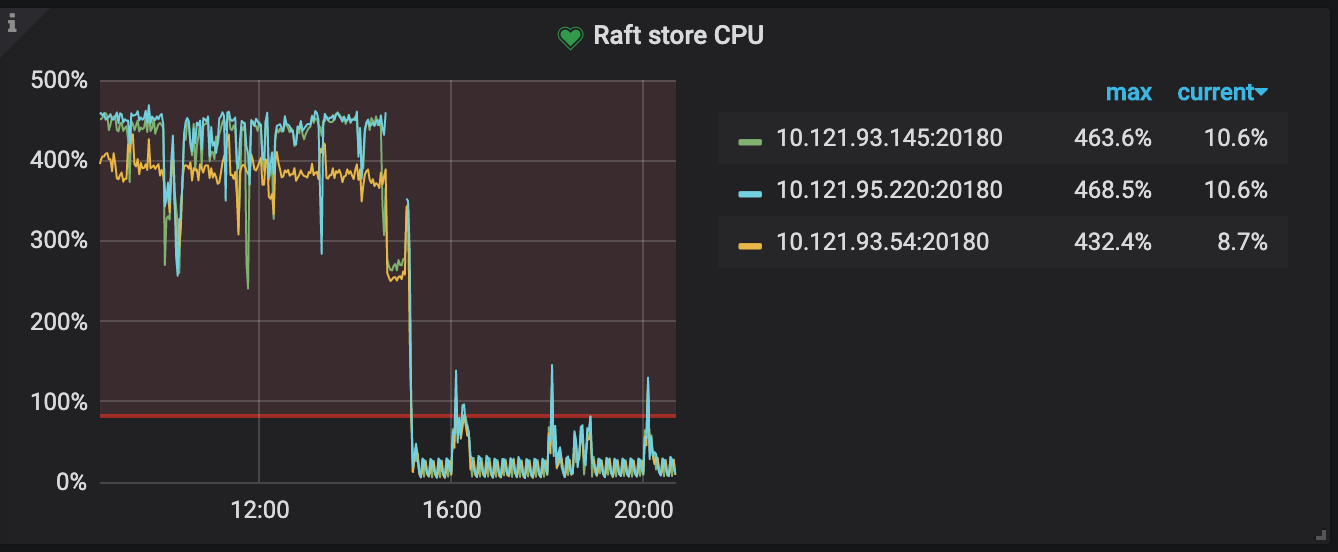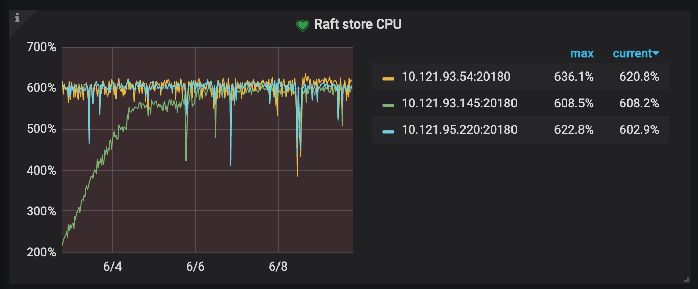 5月29号升级db到4.0,当天raft store cpu占用持续偏高,调整cpu核心前集群几乎不可用,数据严重delay。调整store-pool-size: 2 → 8,有所缓解,但是不知道为什么只用了6个核