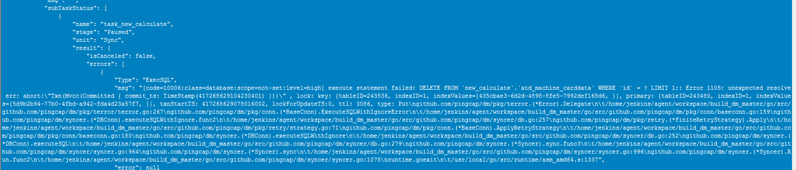 [code=10006:class=database:scope=not-set:level=high] execute statement failed: DELETE FROM new_calculate.atd_machine_carddata WHERE id = ? LIMIT 1;: Error 1105: unexpected resolve err: abort:"Txn(Mvcc(Committed { commit_ts: TimeStamp(417268629104230401) }))" , lock: key: {tableID=243536, indexID=1, indexValues={435cbae3-6d2d-4898-8fe5-7992def165d6, }}, primary: {tableID=243480, indexID=1, indexValues={5d9b2b94-77b0-4fbd-a942-fda4d23a57f7, }}, txnStartTS: 417268629078016002, lockForUpdateTS:0, ttl: 3086, type: Put