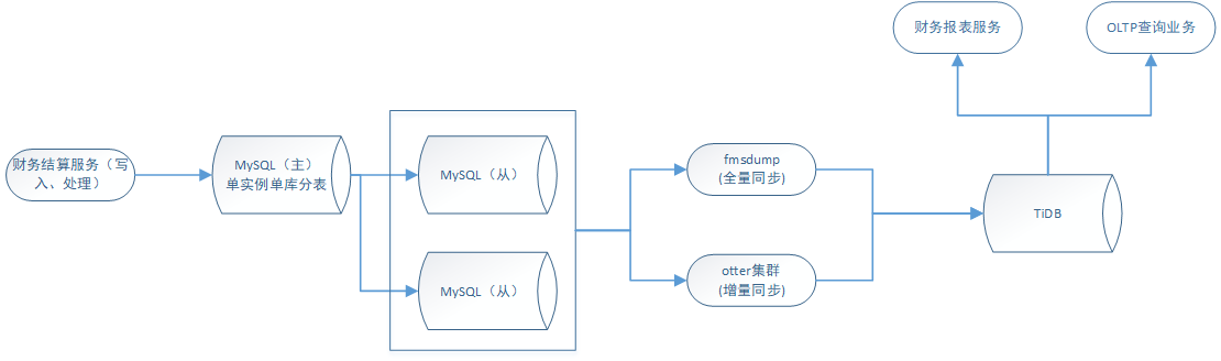 - 解决: 经过调研探索之后,最终的解决方案是自研一份基于数据的同步工具fmsdump,再加上开源项目otter实现MySQL-TiDB的全量同步+增量同步。otter的同步可以实现多表合并到同表并且自定义合并的规则,负载能力可以通过加机器进行扩容,加上可视化的界面操作,使用成本较低。