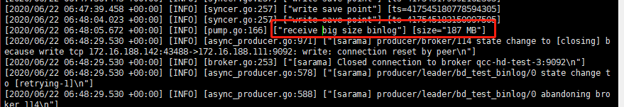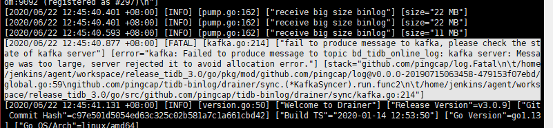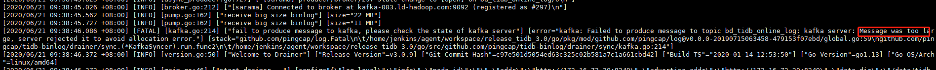 - drainer同步到kafka时,偶发binlog too big,200+M级别,可否过滤筛查到这条binlog消息具体内容