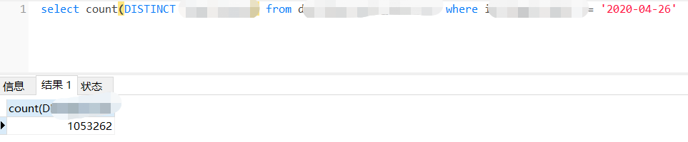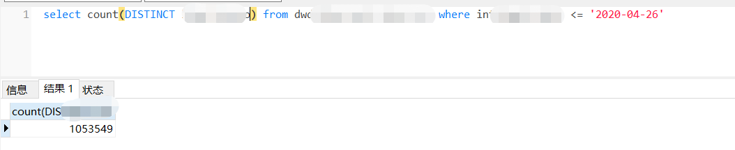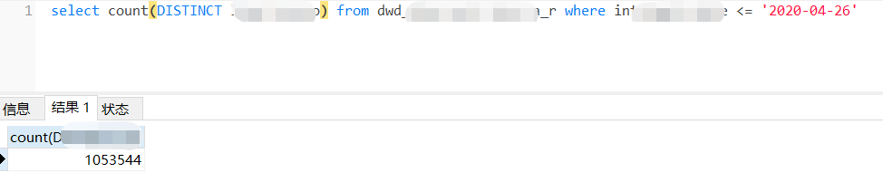 确定没有删除操作, 我有一个按初始时间的过滤条件, <= ‘2020-04-26’ 在mysql里面,这个数据是一次性生成填当前时间,这个条件的数据也不会做更新的, 所以,加上这个条件之后的总条数是不会变了的, count(1)的结果是静止不动的,是1053572, 但是count(distinct主键字段) 结果就开始不对劲了,就是截图里面的