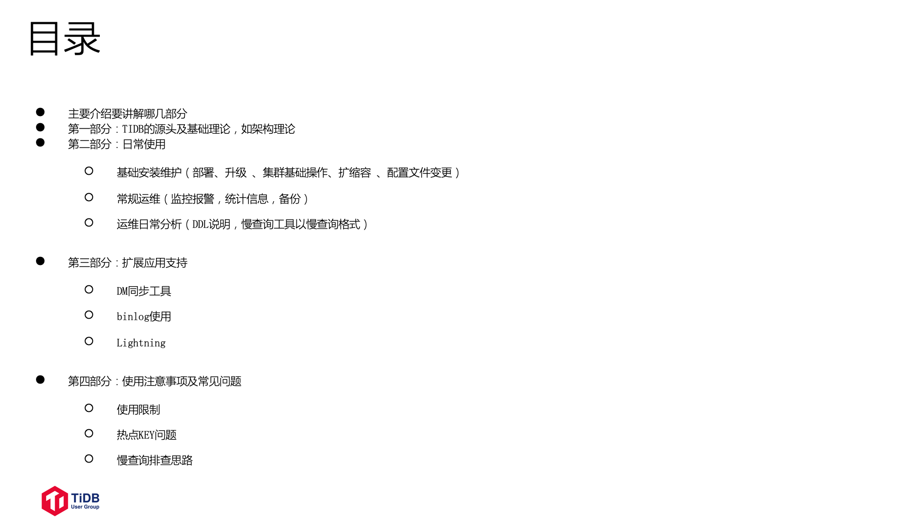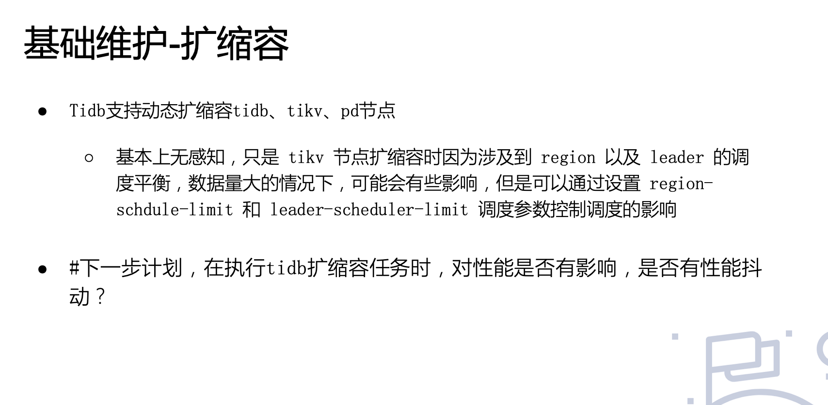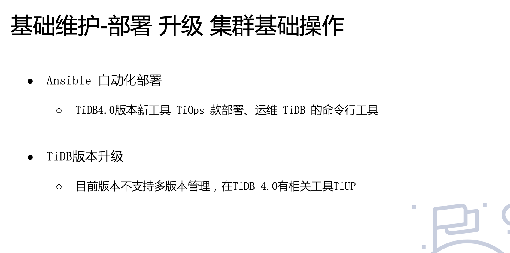2020/7/4 下午 15:00-16:00,来自京东数科的高级 MySQL DBA,2020 年度 TiDB MVA 田朋老师 @田帅萌7 为大家带来了 TiDB 运维基础介绍的直播,分享了 TiDB 理论基础、日常运维、生态工具和注意事项等内容。直播中通过大量演示带大家更直观地了解了一些运维操作。