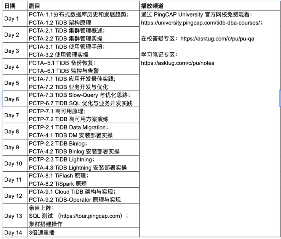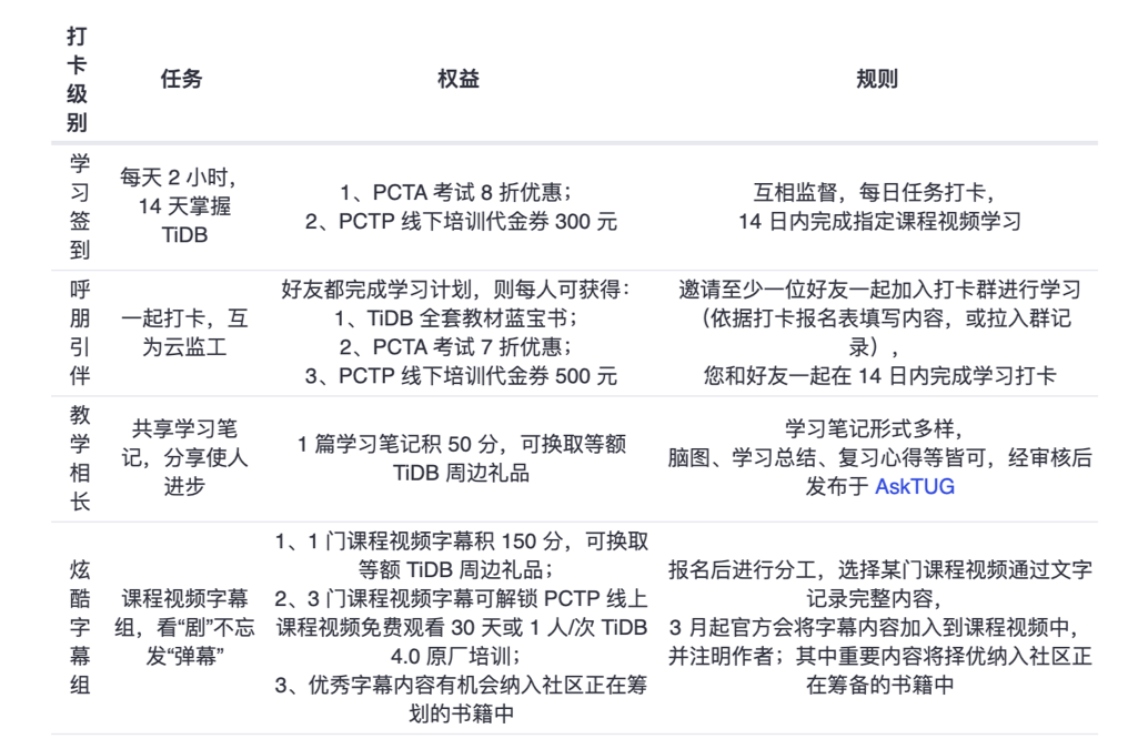 对于想了解 TiDB 的同学可以参加 TiDB 官方组织的 TiDB DBA 14 天追“剧”打卡系列活动。该活动面向零基础 TiDB 爱好者,通过为期 2 周的有节奏的大卡学习,将学习到 TiDB 架构原理、安装部署、周边工具等基础知识,完成任务的同学还将收获 PCTA 考试折扣、PCTP 线下培训代金券、TiDB 精美周边等惊喜大礼。