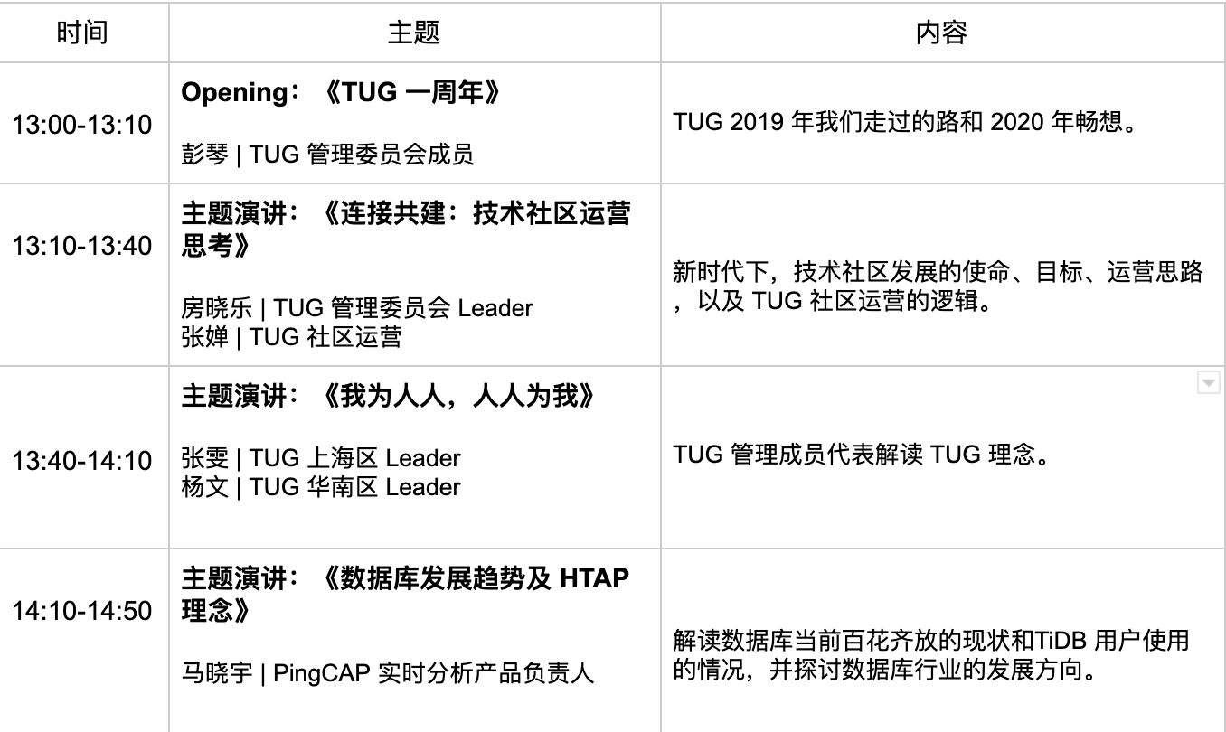 转眼间,TUG 一周岁了。在这一年里,大家因为 TiDB 相识相聚,共同探讨数据库、大数据等话题,一起分享实践经验、相互学习,TUG 已然成为 TiDB 使用者排忧解难、吐槽表达的大本营。值此一周年之际,TUG 将举办一场线下+线上的联动技术会议,为所有 TUG 成员提供一次相聚的机会,畅聊技术、社区、个人发展等贴近你我的话题。