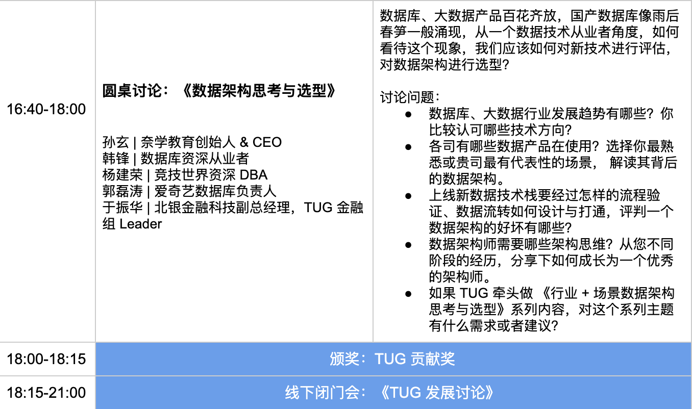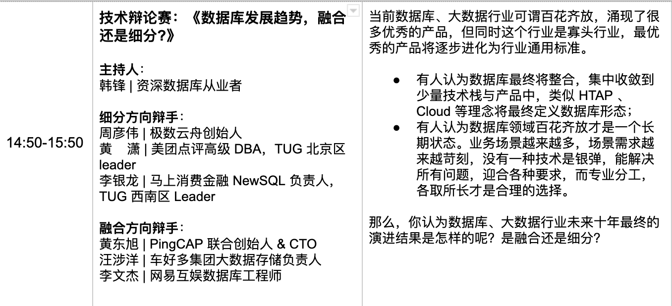 大家已经发现,在诸多话题中,TUG 将迎来一场有趣的辩论赛,邀请多位嘉宾就《数据库发展趋势,融合还是细分?》这个话题发表自己的看法,进行一场思想的碰撞,“真理越辩越明,思路越辩越宽”,希望这样的形式给大家带来更多洞察和启发。