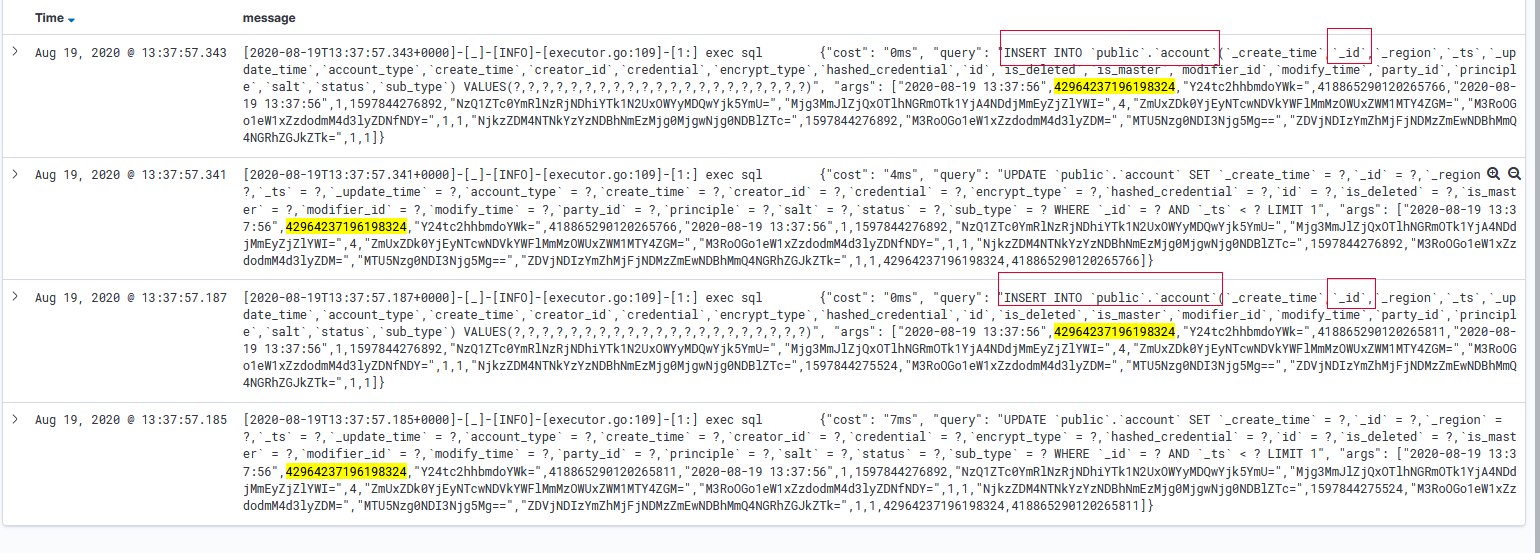 图中的两条插入都成功了,_id 均为42964237196198324,为主键