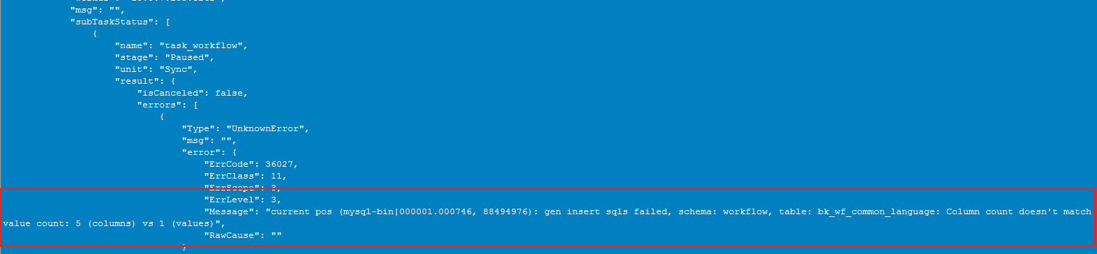 “Message”: “current pos (mysql-bin|000001.000746, 88494976): gen insert sqls failed, schema: workflow, table: bk_wf_common_language: Column count doesn’t match value count: 5 (columns) vs 1 (values)”,