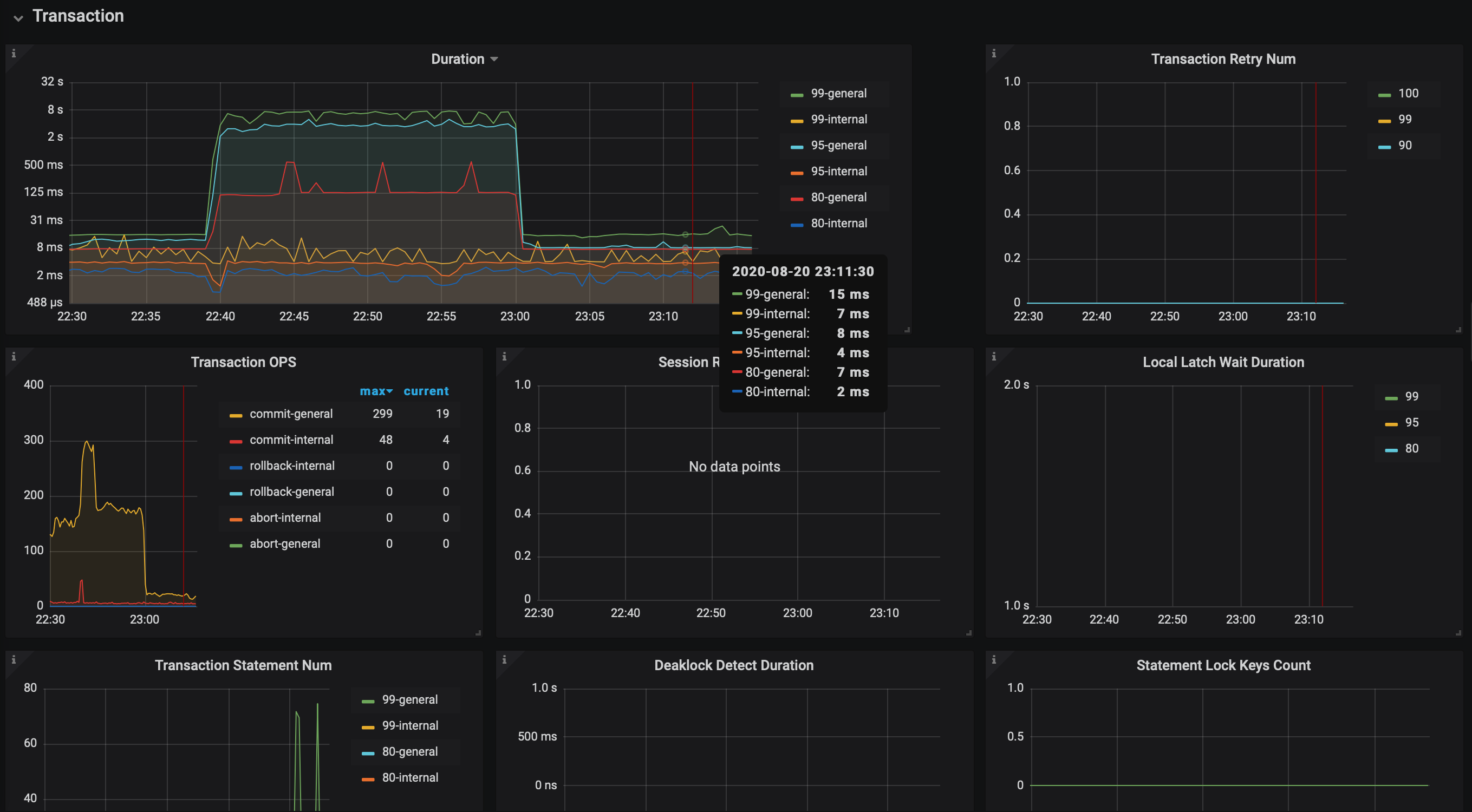 开的乐观锁,几乎没发现kv back,检查的Duration都正常,retry_limit为0,disable_txn_auto_retry为1。