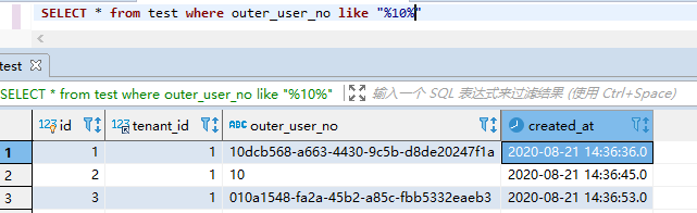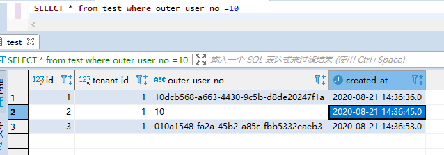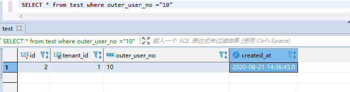 使用SQL: SELECT * from test where user_no =“10” 能正确匹配;