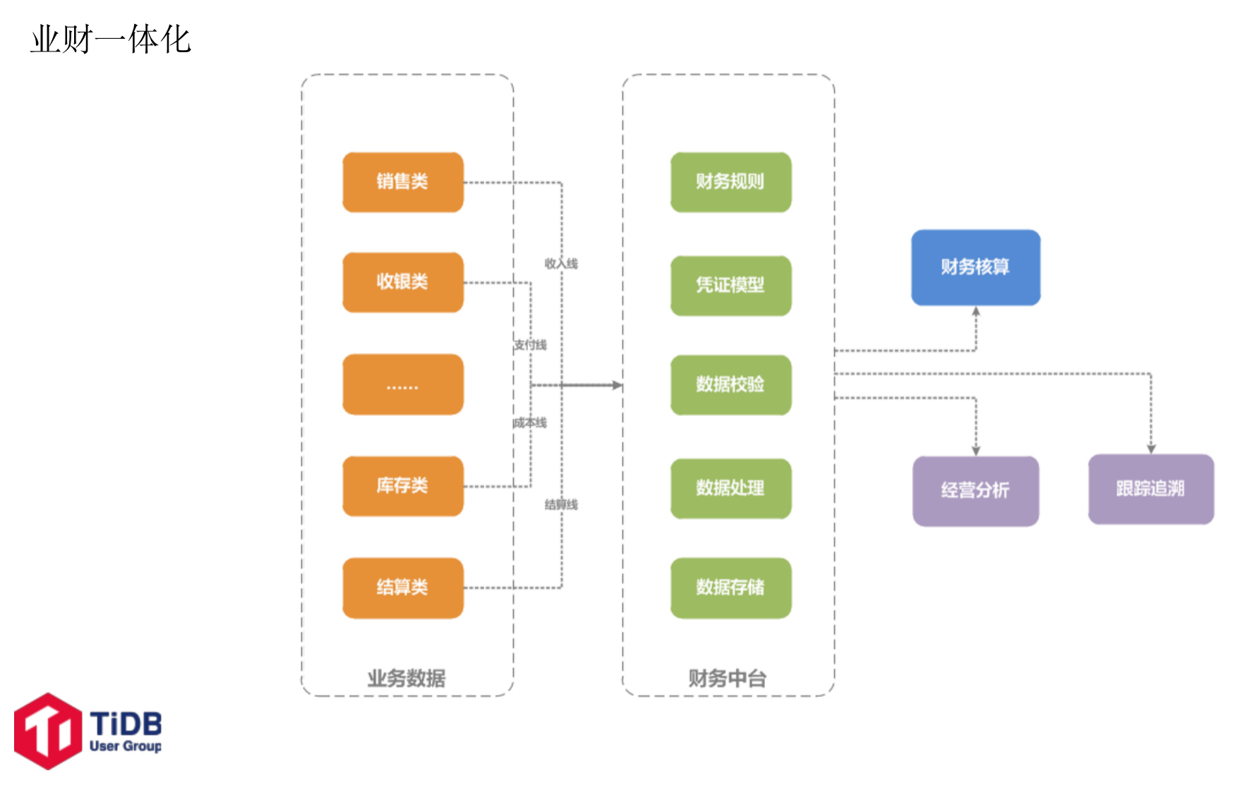 什么是业财一体化,我们先来看一下目前多点的业财一体化的整体架构。我们可以看到这个业务数据里面,销售类的对应财务系统的收入线,收银类对应的支付线,库存类对应成本线,结算类对应结算条线,所有这个业务条线的数据最终会汇聚到我们财务中台里面,通过我们的财务规则、凭证模型、数据校验,以及数据处理、数据存储,整个一套完整的规则体系,来生成我们对应的财务核算的数据。同时需要产出经营分析的相关的一些报表数据,以及进行业务单据和财务单据的跟踪追溯。可能我们传统的财务ERP里面,业务和财务数据是相互独立的,数据难以进行跟踪和追溯,并且只能做到财务核算,不能为这个业务赋能。