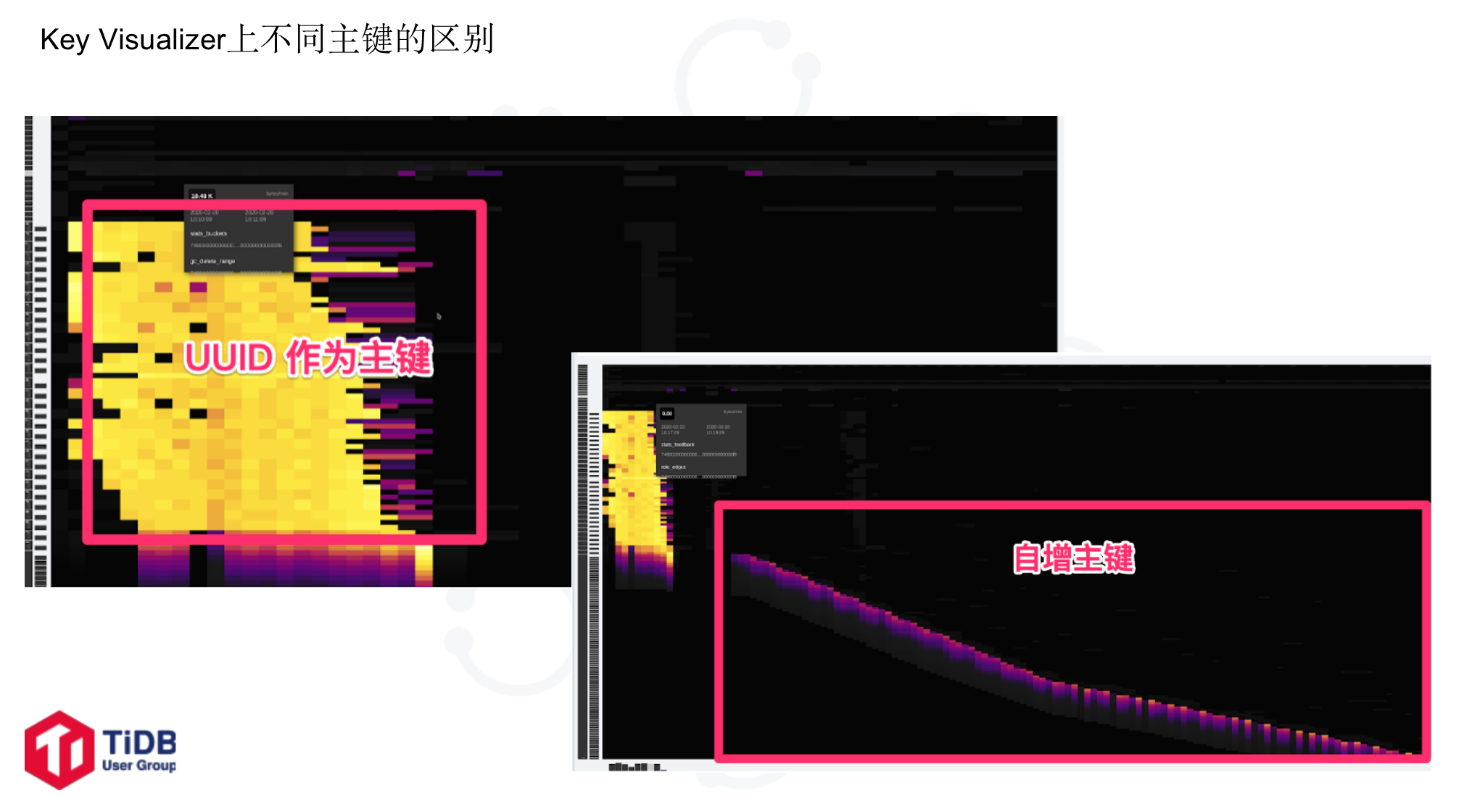 这个是 PingCAP 东旭老师的分享,我把它截取过来,自增主键和 UUID 在我们 TiDB dashboard 上面的一个可视化的监控,这个可以比较直观的看到,如果是用自增主键的这个方式,它是呈线性连续递增的趋势。如果是用 UUID 或者其他一些散列的 ID 作为主键的话,它的分布会比较均匀,不会造成写入热点的问题。