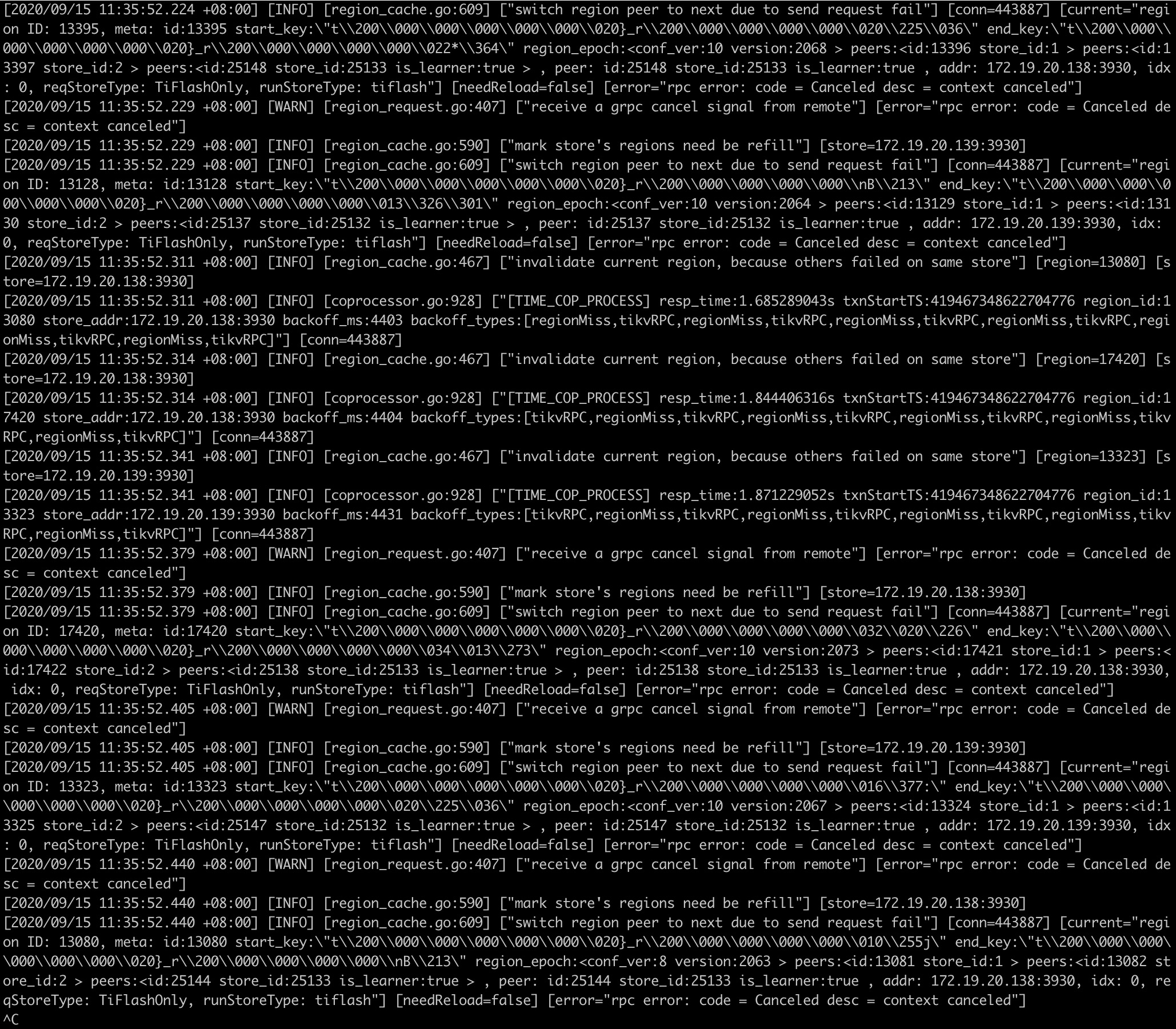 [2020/09/10 11:06:13.733 +08:00] [INFO] [region_cache.go:467] ["invalidate current region, because others failed on same store"] [region=16424] [store=172.19.20.138:3930]