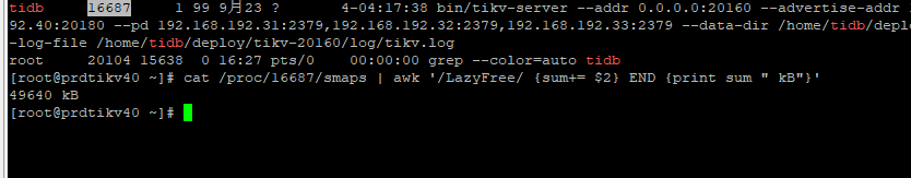 cat /proc/tikv-pid/smaps | awk '/LazyFree/ {sum+= $2} END {print sum " kB"}'