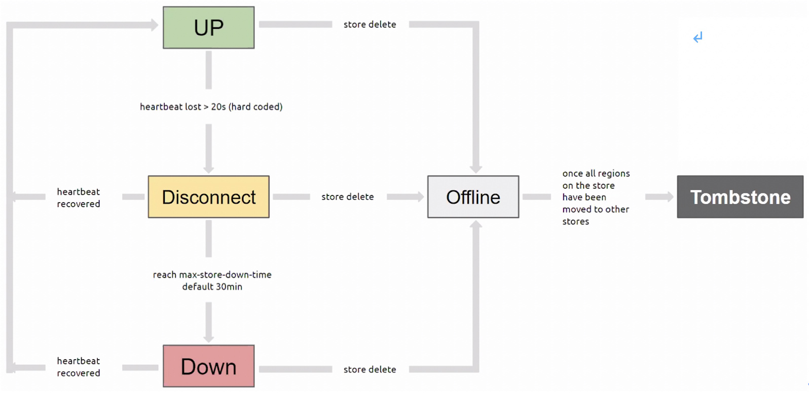 - Disconnect:当 PD 和 TiKV 的心跳信息丢失超过 20s 后,该 TiKV 的状态会变为 Disconnect 状态,当时间超过
