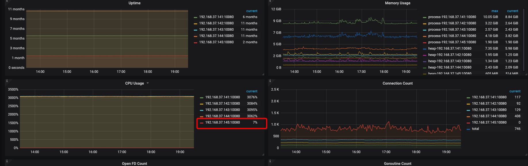 2、负载不均:五台机器, 4台负载极高, 一台无负载.