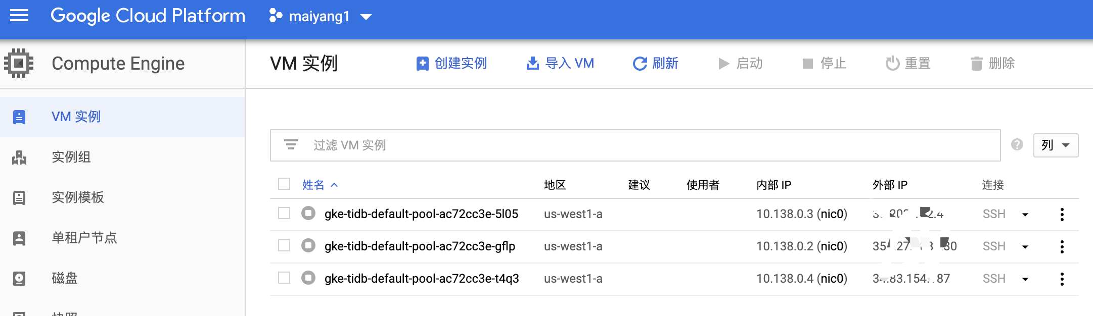 Created [https://container.googleapis.com/v1/projects/maiyang1/zones/us-west1-a/clusters/tidb].