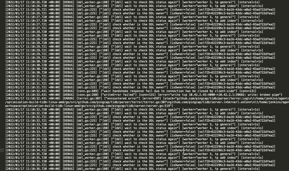 [2022/01/17 11:10:32.431 +00:00] [ERROR] [terror.go:307] [“encountered error”] [error=EOF] [stack=“github.com/pingcap/tidb/parser/terror.Log