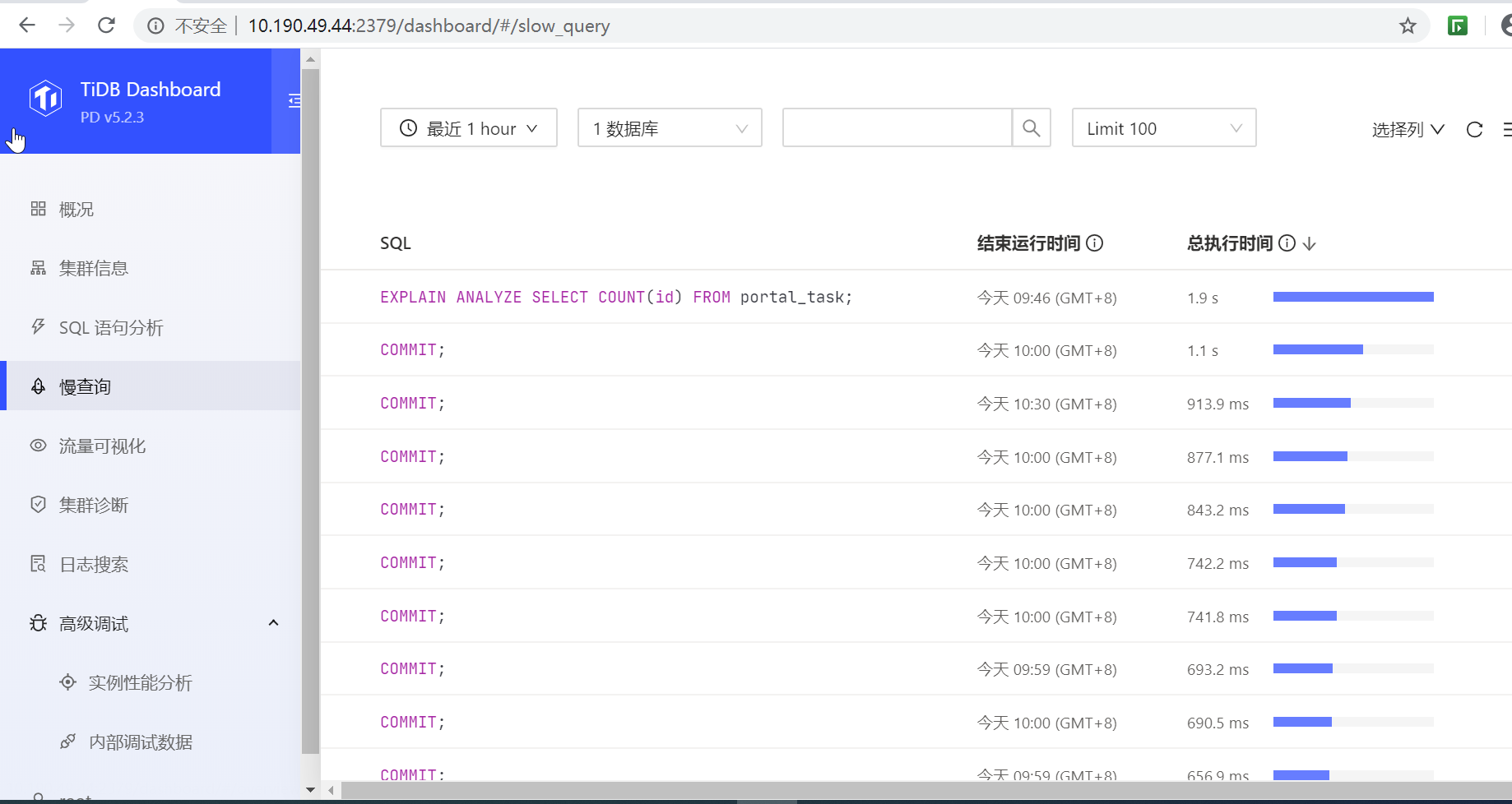 你好,我现在数据库版本是V5.2.3,我在Dashboard的慢查询菜单里看到的慢查询语句都是commit,请问这个问题要怎么排查呢