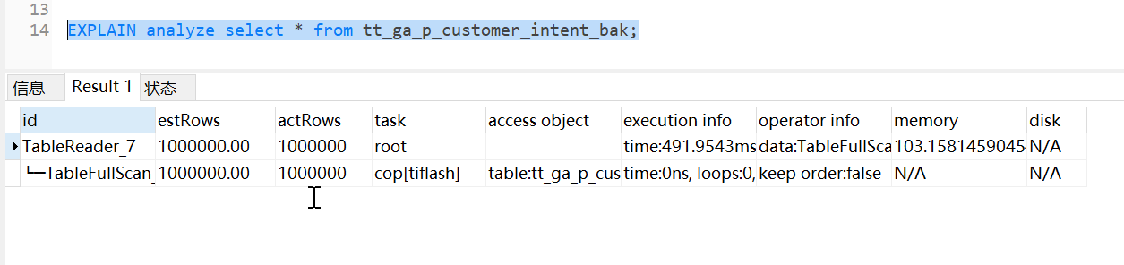 为什么查询的时候tiflash和tikv的效率是差不多的呢,是我使用的方式不对吗?tt_ga_p_customer_intent_bak、tt_ga_p_customer_intent_bak2两张表都是100w的数据,同时tt_ga_p_customer_intent_bak创建了tiflash的副本,如果想提示查询效率要怎么优化呢