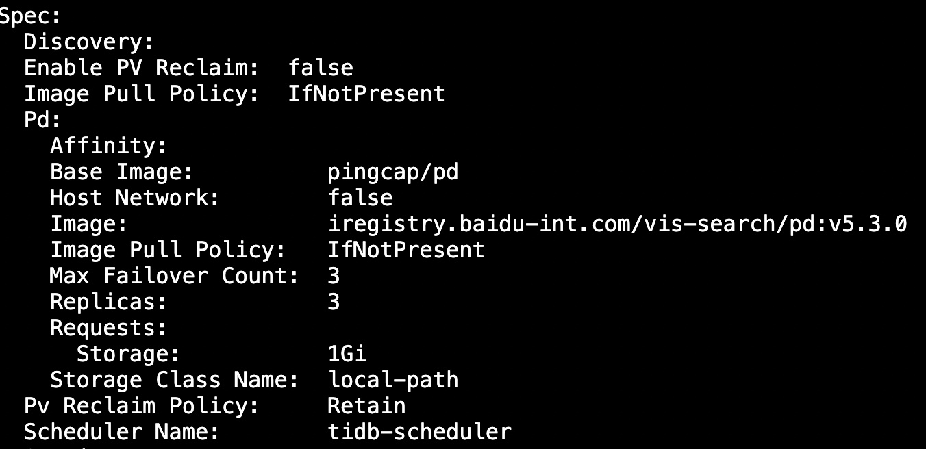 我是这么做了,可以看到我把镜像重新打了 tag 传到了内网镜像仓库,但是还是指定了 pingcap/pd 这个 image,我想让它指定成新版本镜像名