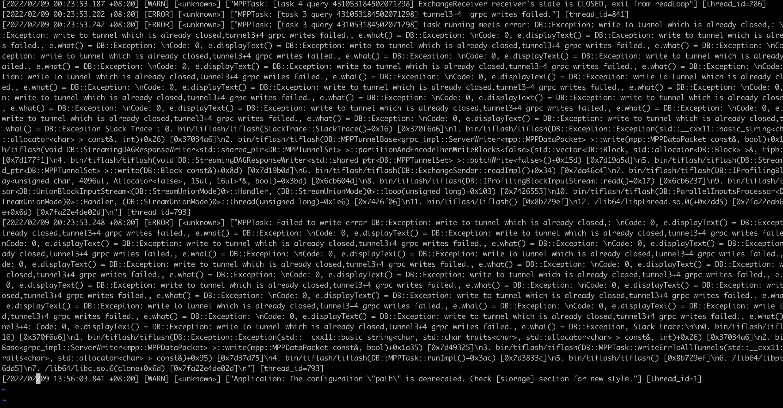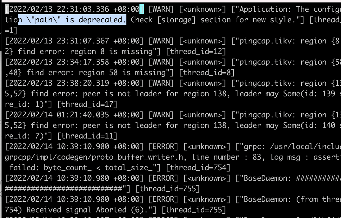 你好 用的三个节点,下面放了节点2的tiflash日志,其余看了下也都差不多tiflash_error.log (215.5 KB) [tiflash1.log|attachmenttidb-test2-TiFlash-Summary_2022-02-17T02_39_51.837Z.json (1.5 MB) ](upload://oNCYGnk2wUZHAL06HTomW5qpcFR.log) (21.0 MB)