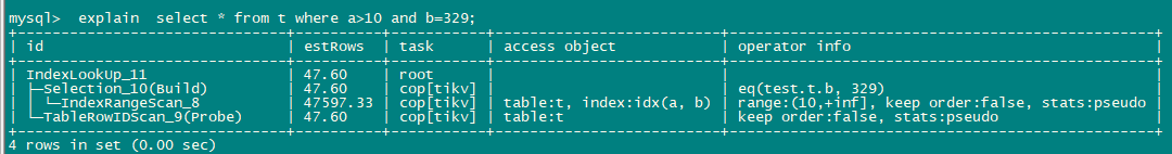你的执行计划是什么样,下面的执行计划IndexRangeScan_8通过a>10的范围扫描索引,然后返回给selection_10算子,该算子通过eq(test.t.b, 329) 过滤符合条件的值,然后在去回表TableRowIDScan_9,在回表前已经进行了过滤