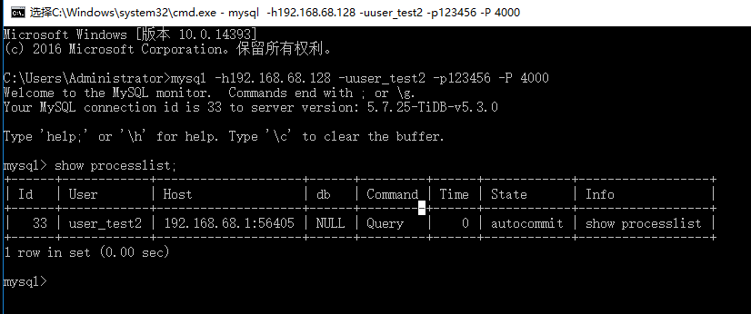 上图中,在cmd下使用user_test1@‘192.168.%’无法登录,但使用user_test2@'%'可以正常登录