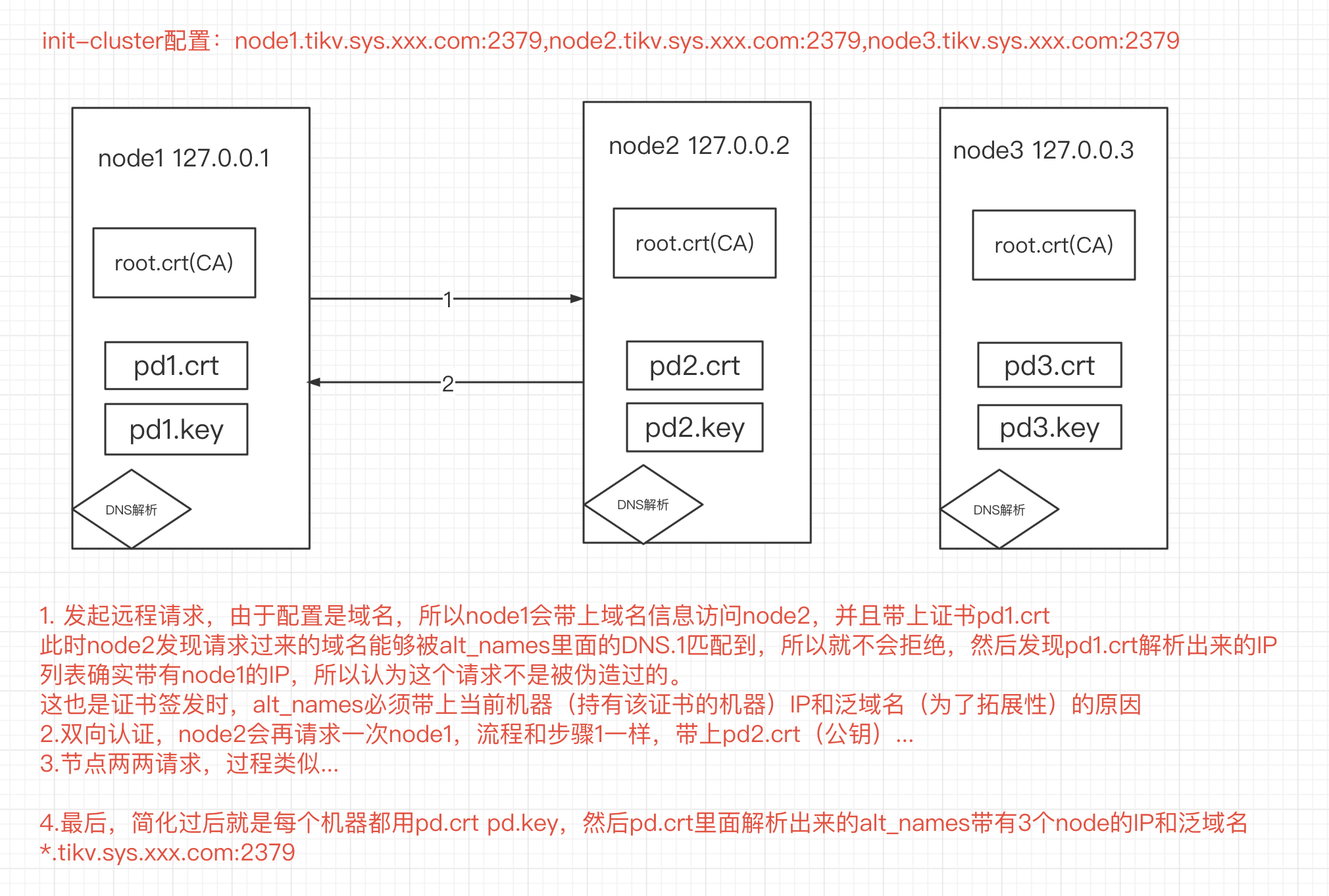 例如我们有3个pd节点,3个tikv节点,客户端连的是pd节点(2379端口),那么在pd扩容的时候只要生成新节点的证书即可,新节点的域名符合DNS.1里面的正则即可,可以不需要动老的节点;如果换机器(IP变了),那么只需要修改域名的A记录、为新的节点生成证书即可;