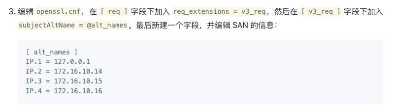当然,可以看出来,这样很麻烦,每个节点都需要配置一个不一样的证书,所以为了简化(偷懒)可以直接将需要用到的机器的IP都列出来,即