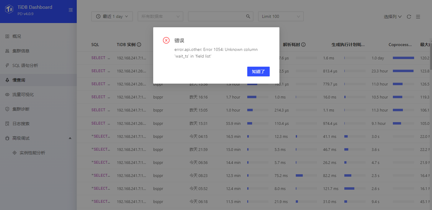 error.api.other: Error 1054: Unknown column ‘wait_ts’ in ‘field list’数据结构的差异出现未知条目,导致数据无法读取。典型兼容性问题