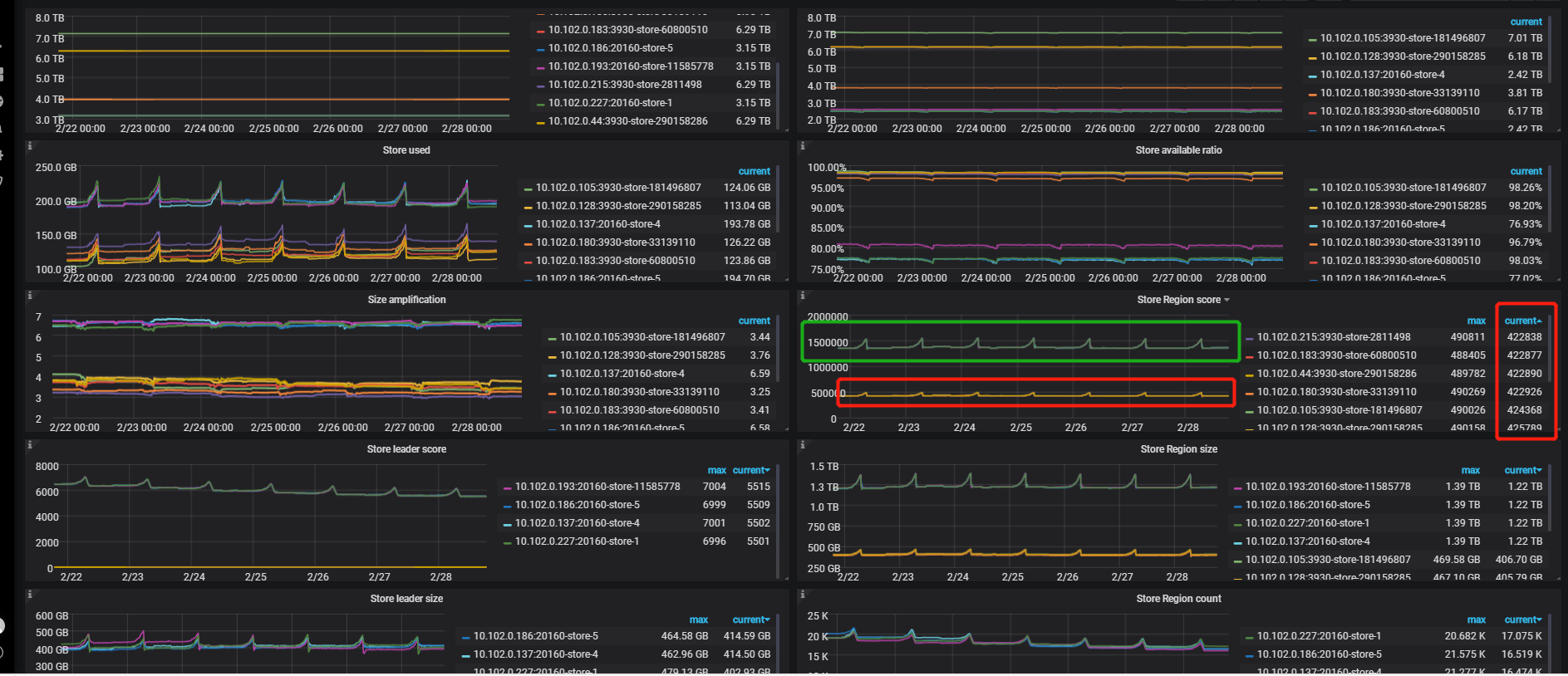 你好,我看相同角色的节点 ,挺均衡的。 绿框是tikv节点(4个/3副本),红框是tiflash节点(8个/2副本)。