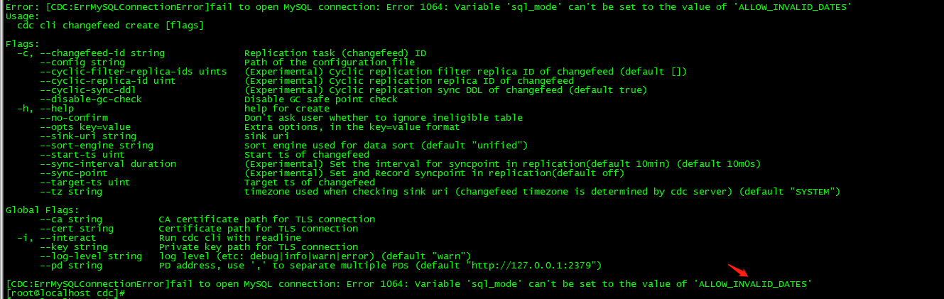 [CDC:ErrMySQLConnectionError]fail to open MySQL connection: Error 1064: Variable ‘sql_mode’ can’t be set to the value of ‘ALLOW_INVALID_DATES’