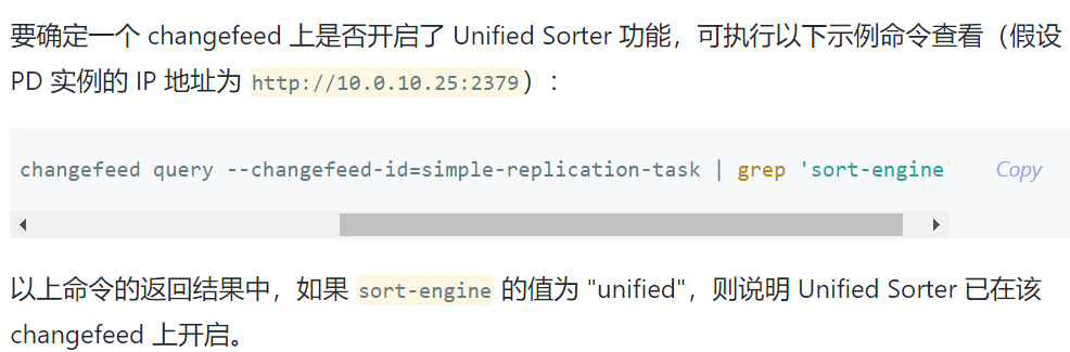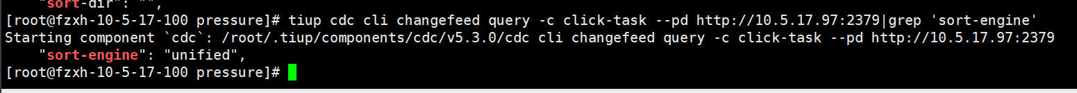 cdc cli --pd=“http://ip:2379” changefeed query --changefeed-id=xxx-task | grep ‘sort-engine’
