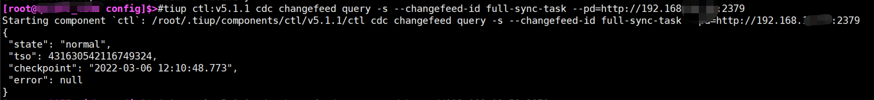 tiup ctl:v5.1.1 cdc changefeed create --pd=http://192.168.x.x:2379 --sink-uri=“tidb://root:***@172.17.x.x:4000/?worker-count=16&max-txn-row=5000” --changefeed-id=“full-sync-task” --sort-engine=“unified” --start-ts=“431574226664947935”