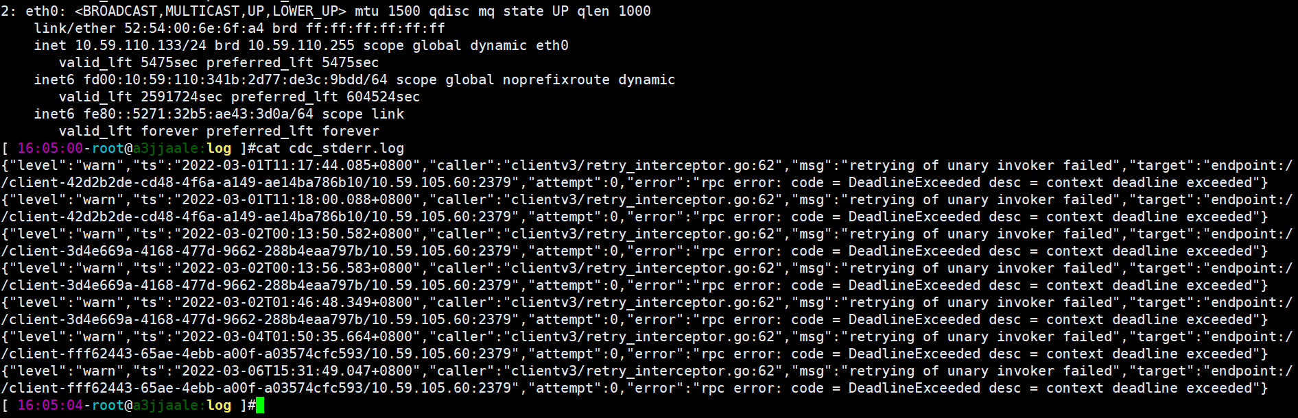 [2022/03/10 15:52:26.202 +08:00] [WARN] [client.go:1162] ["failed to receive from stream"] [addr=10.59.105.50:20161] [storeID=2] [error="rpc error: code = Unavailable desc = transport is closing"]
