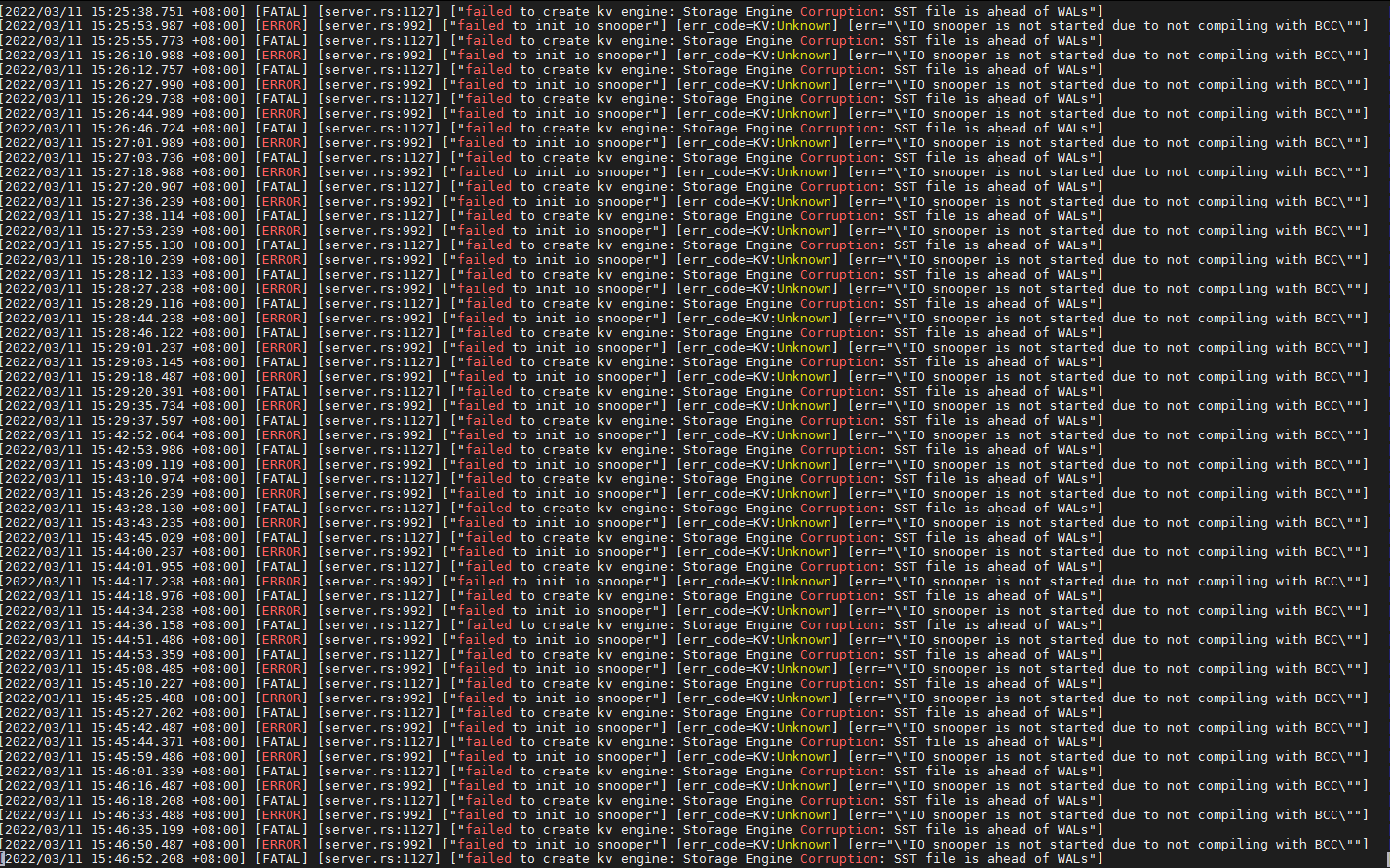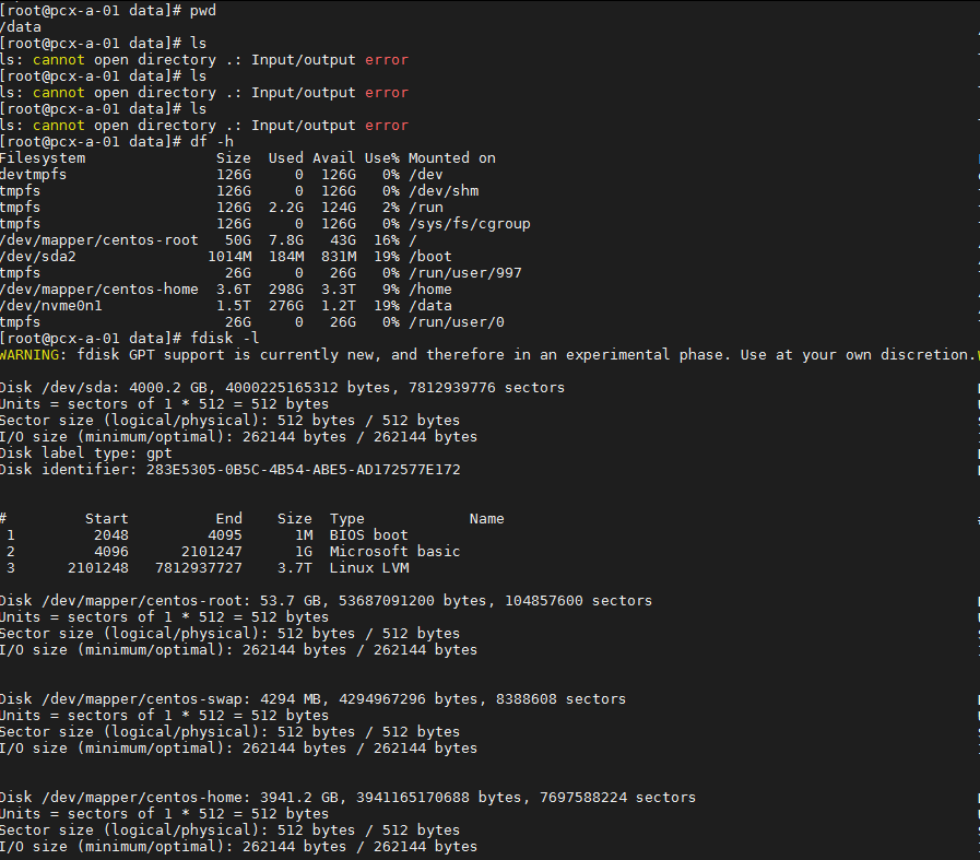 执行sysbench的预加载数据命令导致io报错,导致tikv节点的数据目录的根目录/data IO完全hang住。执行ls命令报错,df命令还可以看到磁盘,fdisk -l命令已经看不到磁盘了,执行命令和现象截图如下: