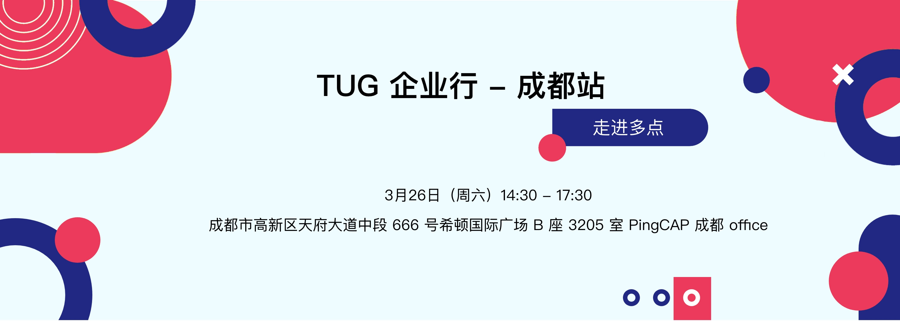 本次企业行,TUG 将与 多点 携手走进 「成都」 ,来 PingCAP 成都 office 听听 来自 多点、G7、腾讯 以及 PingCAP 等企业的技术大咖将分享他们 基于 SaaS 、零售行业的数据存储的挑战和应对方式。