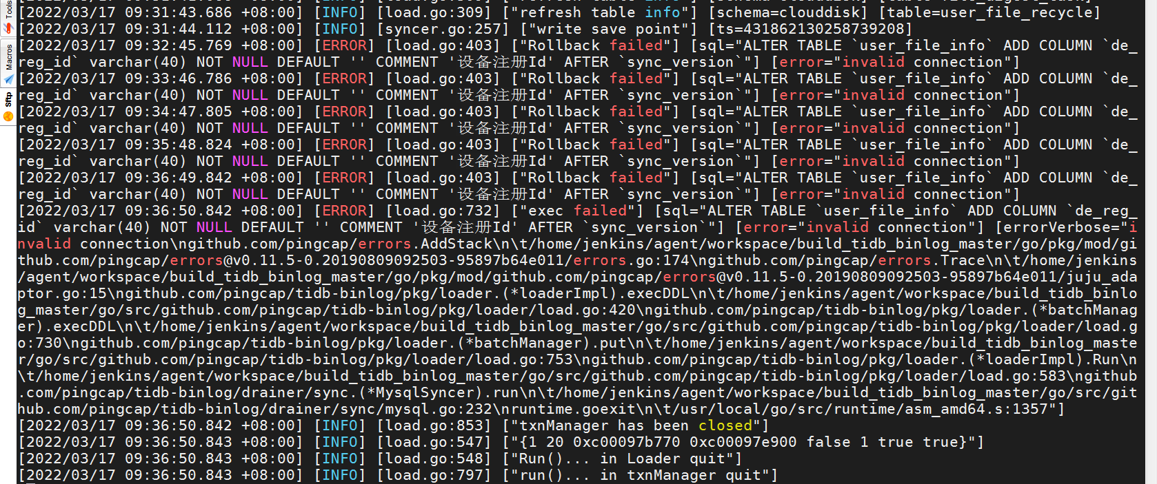 只有等mysql处理完成这个表结构变更,后续在打开Drainer同步就可以了