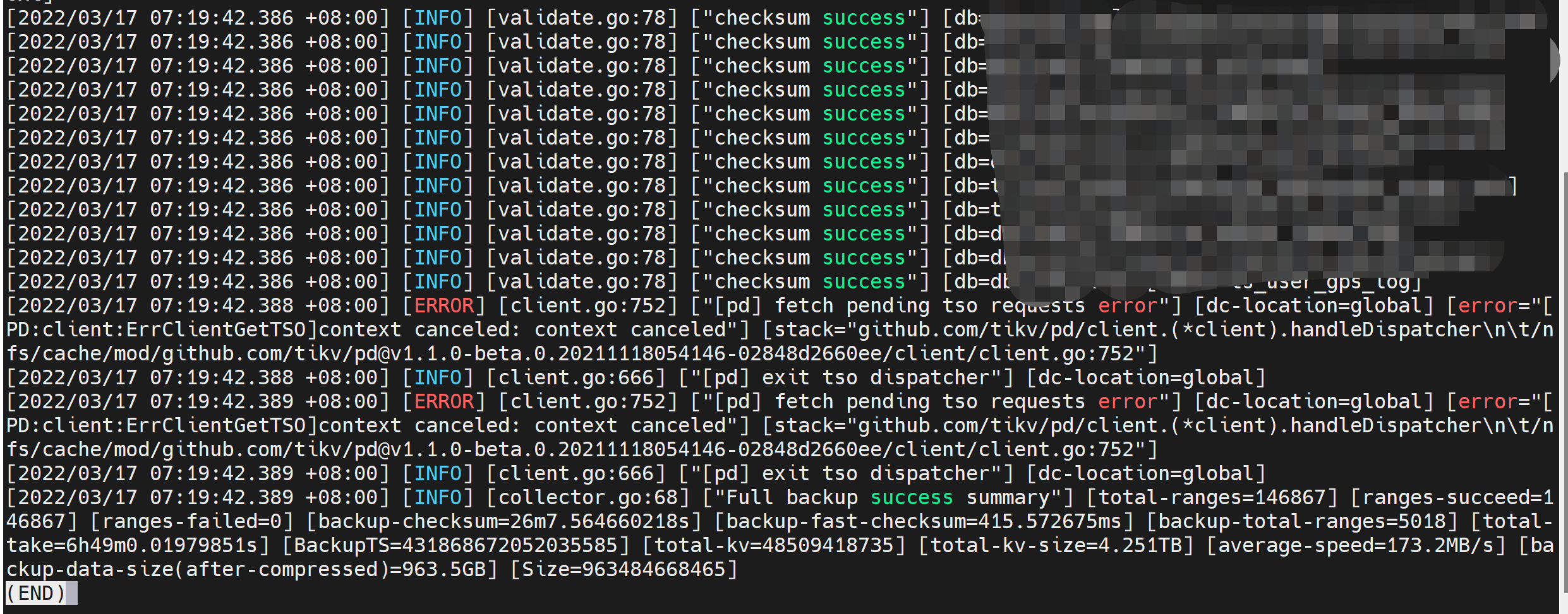 [2022/03/17 07:19:42.388 +08:00] [ERROR] [client.go:752] [“[pd] fetch pending tso requests error”] [dc-location=global] [error=“[PD:client:ErrClientGetTSO]context canceled: context canceled”] [stack=“github.com/tikv/pd/client.(*client).handleDispatcher