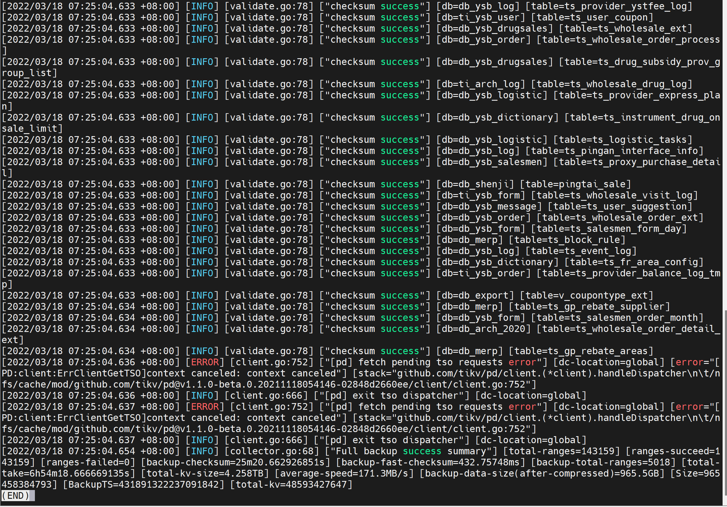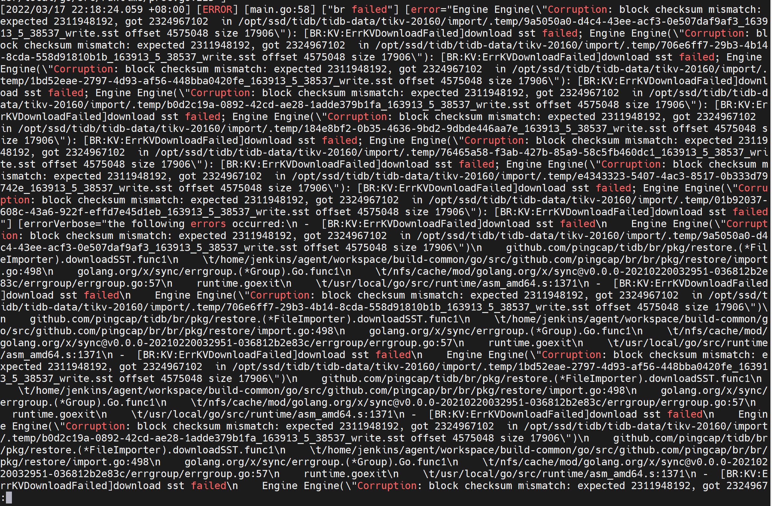 这个报错好像并不能忽略,我们用这些备份的数据在全新的同版本TIDB集群中进行了BR全量恢复,最后出现以下错误:
