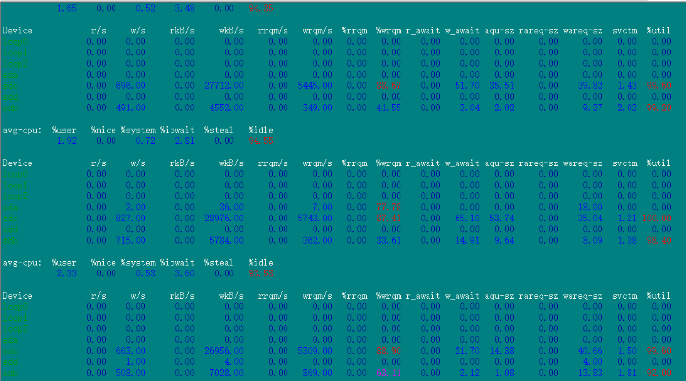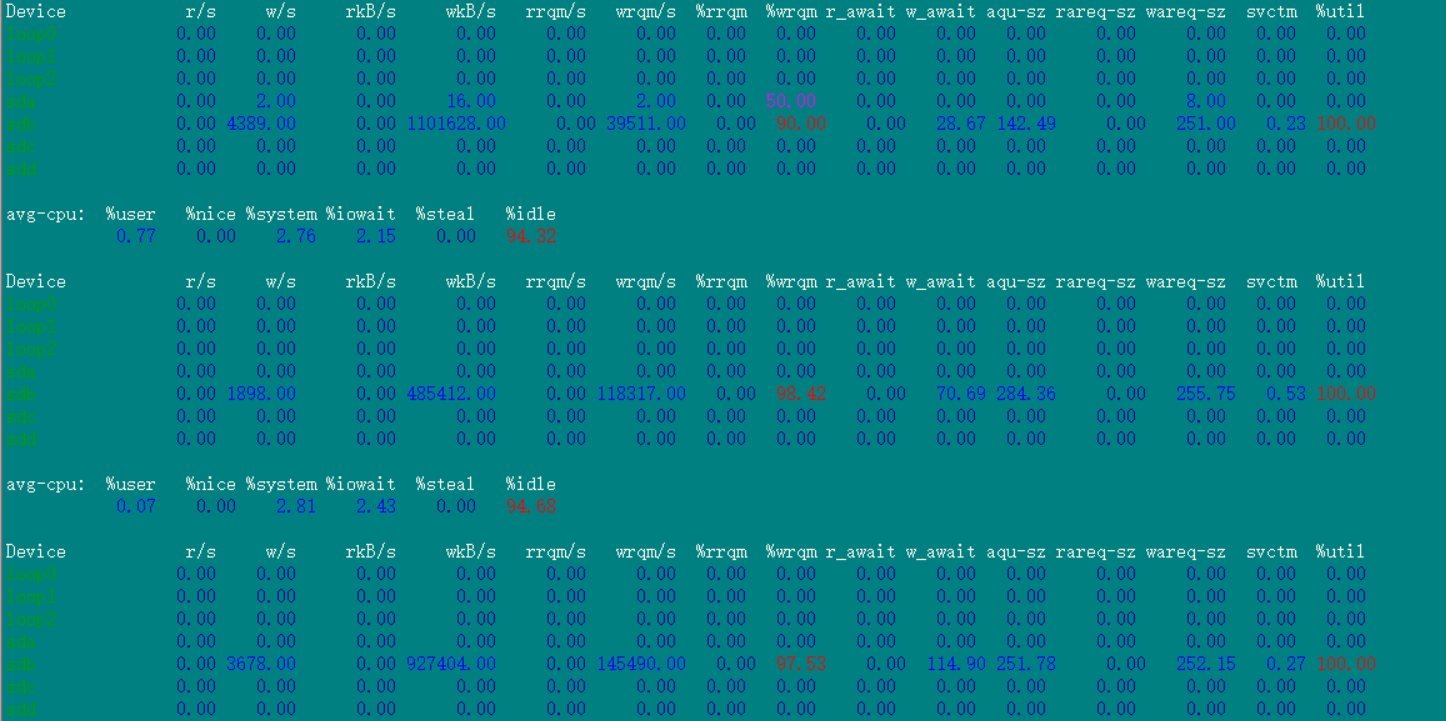 这是在跑sysbench时候iostat -x 1 10 命令的结果