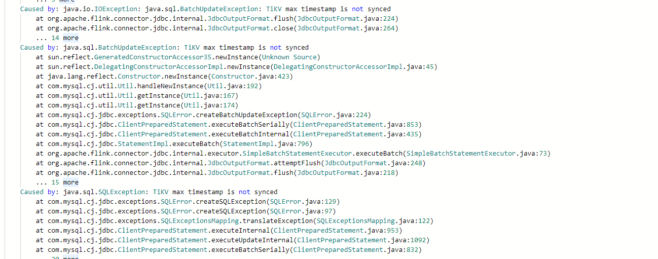 【概述】 Java 消费 Kakfa 数据写入 TiDB 中,今天发现TiDB中没有数据进入,排查问题后定位到Java 在写入 TiDB时报错。报错信息如下: