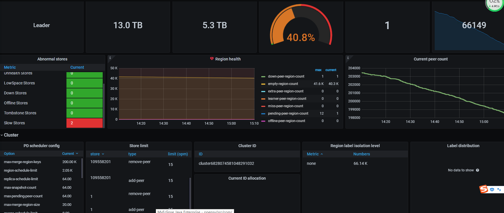 错误完整的贴一下,另外从你监控的截图推测,你应该是一共有三个store,然后现在两个处于slow store状态,应该是哪卡住了啊,是不是IO不够了