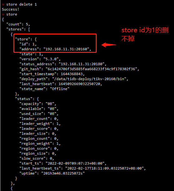 tikv测试服务器(192.168.11.31)有一台已经宕机了,起不来了,然后在集群里面删除这台tikv,删除不了,于是加了一个–force