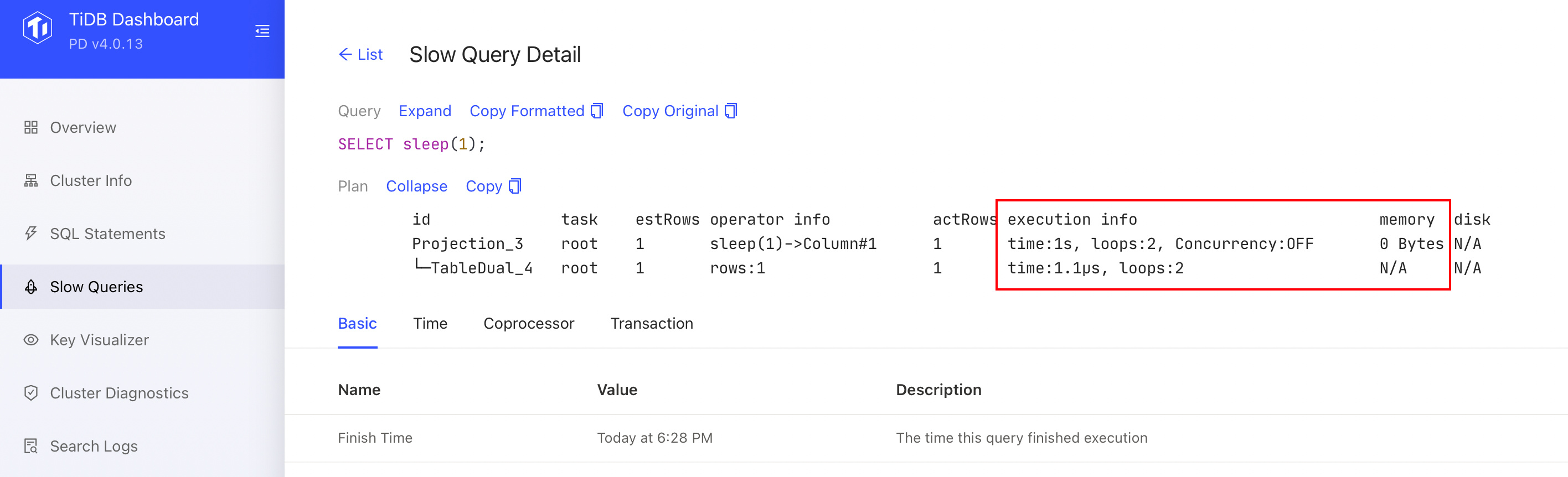 v4.0.13 版本中,点进慢查询的详情后,执行计划中显示的已是 EXPLAIN ANALYZE 信息(而非 EXPLAIN 信息),如图所示,会包含各个算子的详细执行时间及行数等信息:
