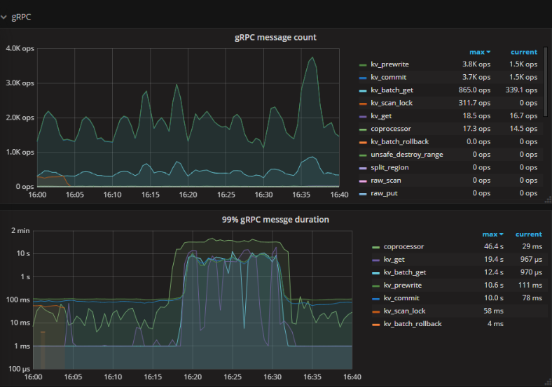 如果确认 TiKV 后端组件没有延迟升高的情况,那 TiKV 侧的延迟应该来源于 gRPC,推测 gRPC 受网络带宽影响可能会有消息堆积