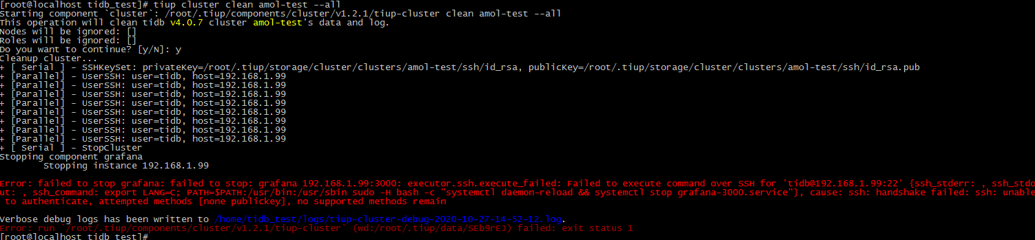 LINUX单机实例上刚开始安装tidb的时候没有成功,想重新部署,发现无法销毁。