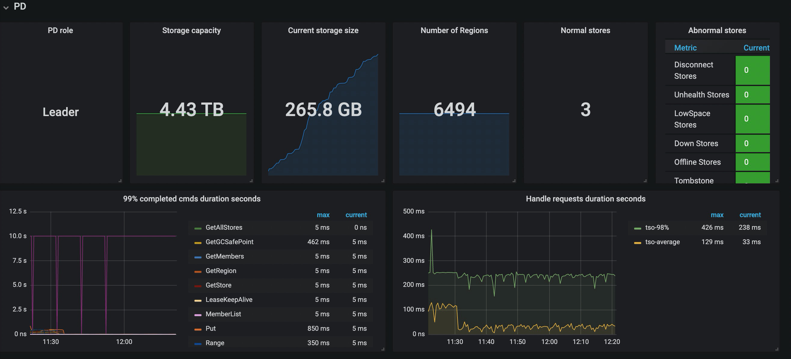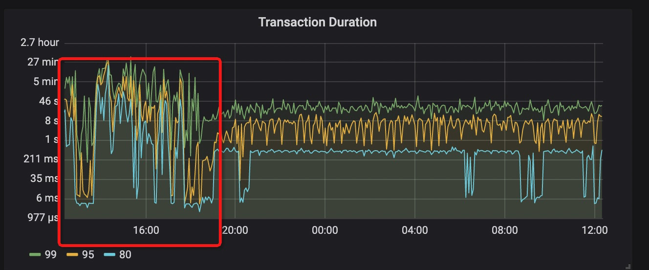 TiDB 侧的 kv-get, kv-batch-get 等操作的 P99 耗时超过 10s ,但是 tikv 侧的 grpc_message 的 P99 耗时为几毫秒。TiDB 在 tso_wait 的 P99 耗时也有 1 s, 服务器的 cpu 比价空闲,PD 也没有产生很多调度 operator.