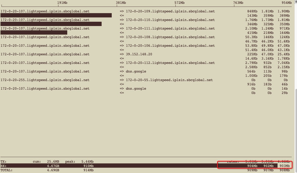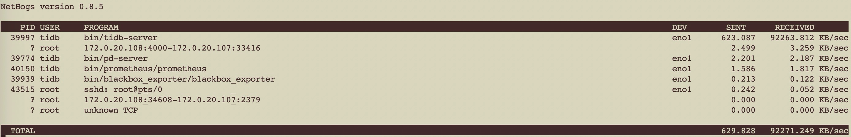 进一步诊断发现其中两台TiDB带宽(1000M)占用非常高,ping其它机器延时高达200ms(正常是0点几ms才对);