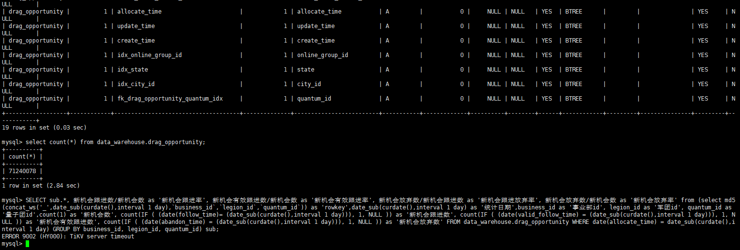 但是大查询,亿级别表count,group by等操作要到5号下午才可以执行。5号中午对一部分关键表进行了analyze table,analyze过程中会有超时异常,多次analyze之后,表就可以用了